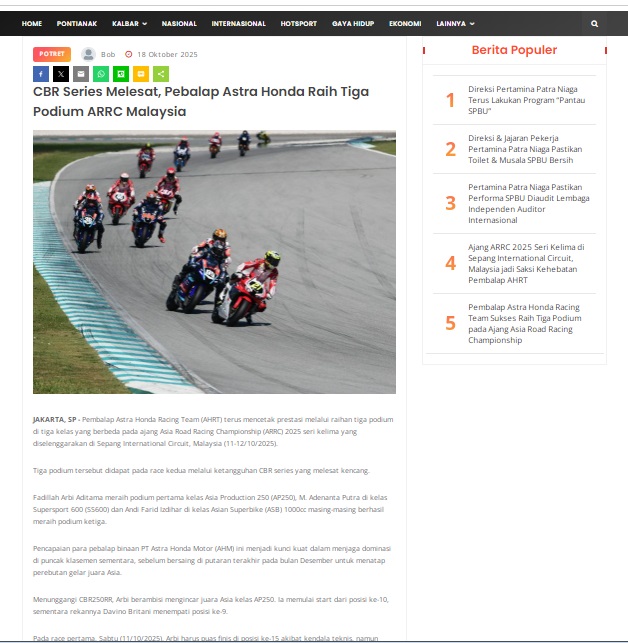 CBR Series Melesat, Pebalap Astra Honda Raih Tiga Podium ARRC Malaysia by masmul 18 Oktober 2025 in Silahkan kunjungi https://www.suarapemredkalbar.com/read/potret/18102025/cbr-series-melesat-pebalap-astra-honda-raih-tiga-podium-arrc-malaysia. You Might Like Regional Public Launching New ADV160 The SUV Pride Grand Launching New PCX 160 Truly Exceptional! Tetap hati-hati ya bro sist berkendara saat hujan.