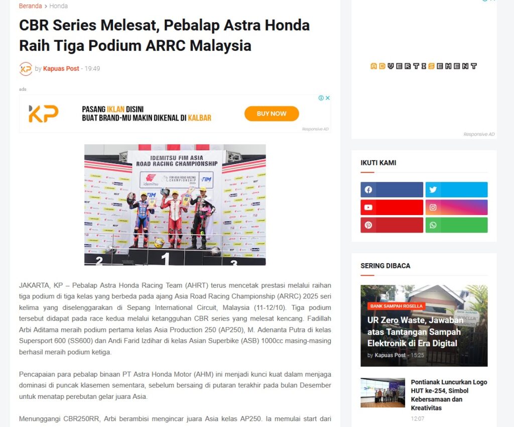 CBR Series Melesat, Pebalap Astra Honda Raih Tiga Podium ARRC Malaysia by Muhammad Arif 19 Oktober 2025 in Silahkan kunjungi https://www.kapuaspost.web.id/2025/10/cbr-series-melesat-pebalap-astra-honda.html. Tags: astra Astra Motor kalbar Astra Motor Pontianak astramotor honda kalbar pontianak sepeda motor You Might Like Regional Public Launching New ADV160 The SUV Pride Grand Launching New PCX 160 Truly Exceptional! Tetap hati-hati ya bro sist berkendara saat hujan.