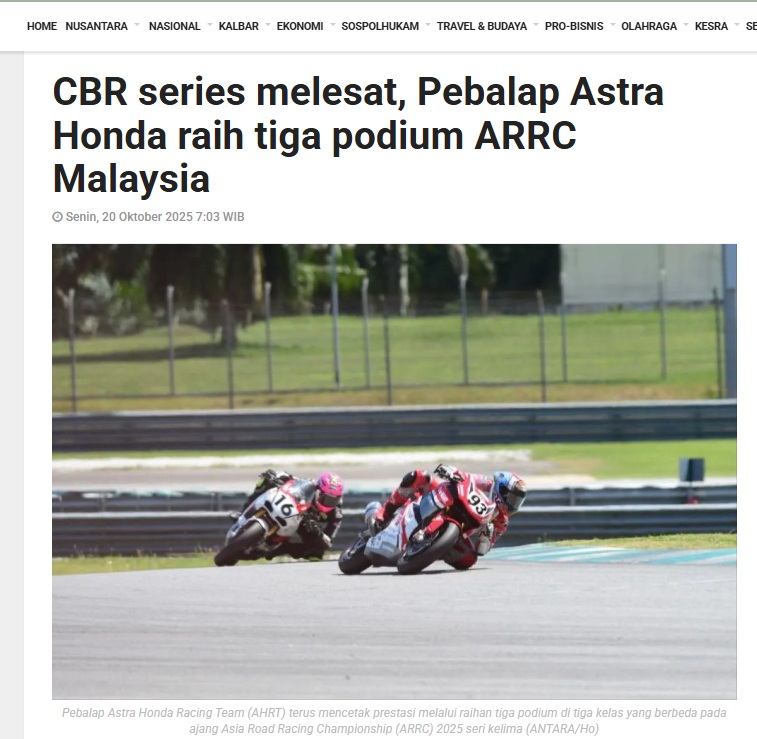 CBR series melesat, Pebalap Astra Honda raih tiga podium ARRC Malaysia by Dedi 20 Oktober 2025 in Silahkan kunjungi https://kalbar.antaranews.com/berita/670233/cbr-series-melesat-pebalap-astra-honda-raih-tiga-podium-arrc-malaysia. You Might Like Regional Public Launching New ADV160 The SUV Pride Grand Launching New PCX 160 Truly Exceptional! Tetap hati-hati ya bro sist berkendara saat hujan.