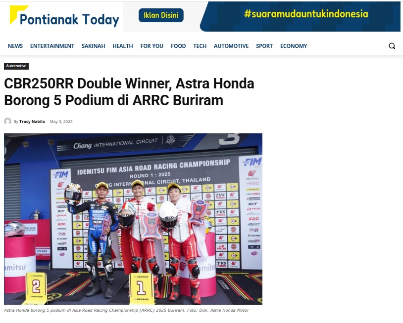 CBR250RR Double Winner, Astra Honda Borong 5 Podium di ARRC Buriram by Leo Prima 3 Mei 2025 in Silahkan kunjungi https://pontianaktoday.id/cbr250rr-double-winner-astra-honda-borong-5-podium-di-arrc-buriram/. Tags: ARRC Buriram Asmo Kalbar Astra Motor Klabar CBR250RR Double Winner Honda Kalbar Motor Honda PT AHM You Might Like Regional Public Launching New ADV160 The SUV Pride Grand Launching New PCX 160 Truly Exceptional! Tetap hati-hati ya bro sist berkendara saat hujan.