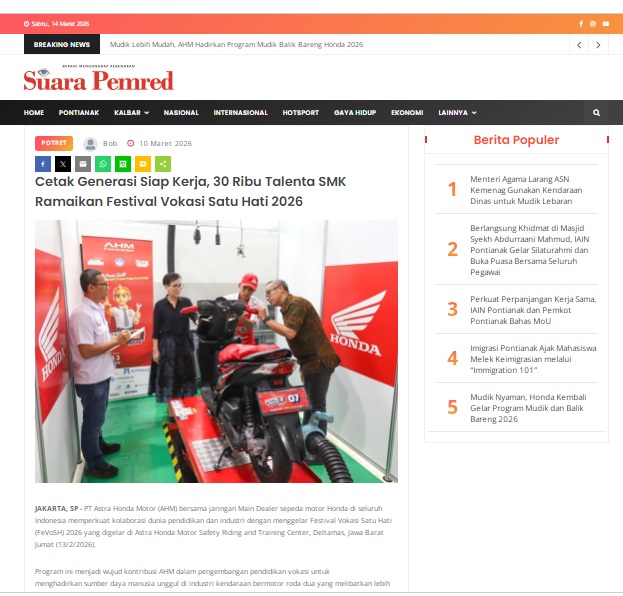 Cetak Generasi Siap Kerja, 30 Ribu Talenta SMK Ramaikan Festival Vokasi Satu Hati 2026 by masmul 10 Maret 2026 in Silahkan kunjungi https://www.suarapemredkalbar.com/read/potret/10032026/cetak-generasi-siap-kerja-30-ribu-talenta-smk-ramaikan-festival-vokasi-satu-hati-2026-1. You Might Like Regional Public Launching New ADV160 The SUV Pride Grand Launching New PCX 160 Truly Exceptional! Tetap hati-hati ya bro sist berkendara saat hujan.