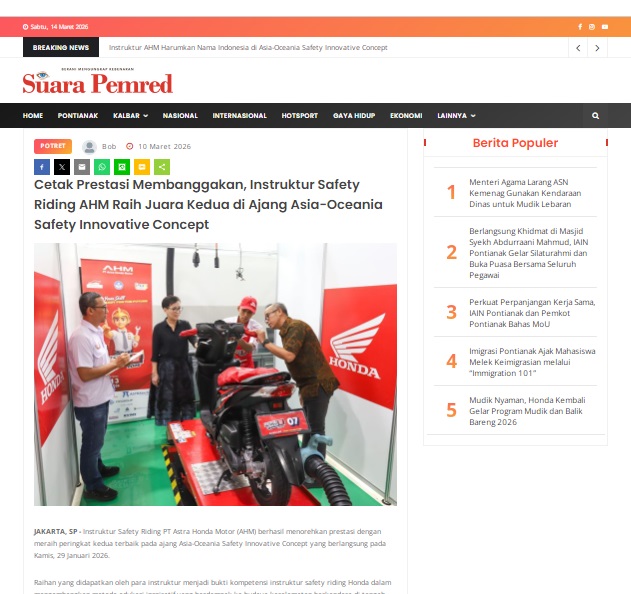 Cetak Prestasi Membanggakan, Instruktur Safety Riding AHM Raih Juara Kedua di Ajang Asia-Oceania Safety Innovative Concept by masmul 10 Maret 2026 in Silahkan kunjungi https://www.suarapemredkalbar.com/read/potret/10032026/cetak-prestasi-membanggakan-instruktur-safety-riding-ahm-raih-juara-kedua-di-ajang-asia-oceania-safety-innovative-concept. You Might Like Regional Public Launching New ADV160 The SUV Pride Grand Launching New PCX 160 Truly Exceptional! Tetap hati-hati ya bro sist berkendara saat hujan.