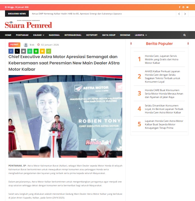 Chief Executive Astra Motor Apresiasi Semangat dan Kebersamaan saat Peresmian New Main Dealer AStra Motor Kalbar by masmul 2 Januari 2026 in Silahkan kunjungi https://www.suarapemredkalbar.com/read/potret/02012026/chief-executive-astra-motor-apresiasi-semangat-dan-kebersamaan-saat-peresmian-new-main-dealer-astra-motor-kalbar. You Might Like Regional Public Launching New ADV160 The SUV Pride Grand Launching New PCX 160 Truly Exceptional! Tetap hati-hati ya bro sist berkendara saat hujan.