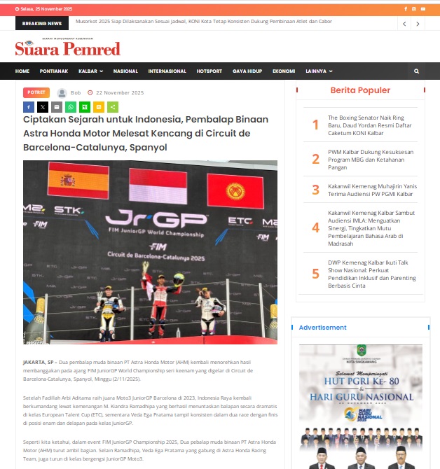 Ciptakan Sejarah untuk Indonesia, Pembalap Binaan Astra Honda Motor Melesat Kencang di Circuit de Barcelona-Catalunya, Spanyol by masmul 22 November 2025 in Silahkan kunjungi https://www.suarapemredkalbar.com/read/potret/22112025/ciptakan-sejarah-untuk-indonesia-pembalap-binaan-astra-honda-motor-melesat-kencang-di-circuit-de-barcelona-catalunya-spanyol. You Might Like Regional Public Launching New ADV160 The SUV Pride Grand Launching New PCX 160 Truly Exceptional! Tetap hati-hati ya bro sist berkendara saat hujan.