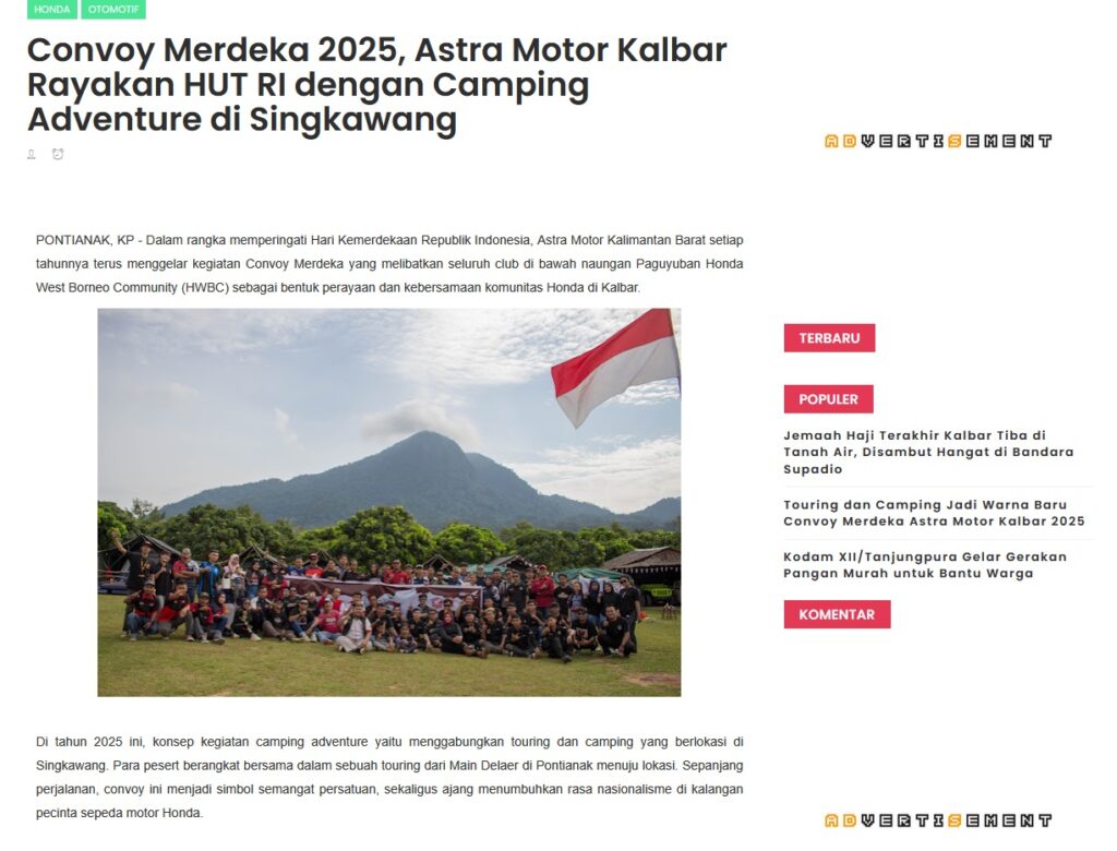 Convoy Merdeka 2025, Astra Motor Kalbar Rayakan HUT RI dengan Camping Adventure di Singkawang by Muhammad Arif 3 September 2025 in Silahkan kunjungi https://www.kapuaspost.web.id/2025/09/convoy-merdeka-2025-astra-motor-kalbar.html. Tags: astra Astra Motor kalbar Astra Motor Pontianak astramotor honda kalbar pontianak sepeda motor You Might Like Regional Public Launching New ADV160 The SUV Pride Grand Launching New PCX 160 Truly Exceptional! Tetap hati-hati ya bro sist berkendara saat hujan.