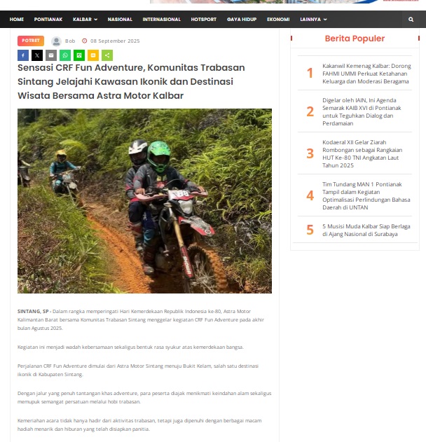 Convoy Merdeka, Touring Panjang Paguyuban Honda West Borneo Community dari Pontianak ke Singkawang by masmul 8 September 2025 in Silahkan kunjungi https://www.suarapemredkalbar.com/read/potret/08092025/convoy-merdeka-touring-panjang-paguyuban-honda-west-borneo-community-dari-pontianak-ke-singkawang. You Might Like Regional Public Launching New ADV160 The SUV Pride Grand Launching New PCX 160 Truly Exceptional! Tetap hati-hati ya bro sist berkendara saat hujan.
