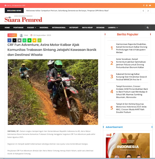 CRF Fun Adventure, Astra Motor Kalbar Ajak Komunitas Trabasan Sintang Jelajahi Kawasan Ikonik dan Destinasi Wisata by masmul 3 September 2025 in Silahkan kunjungi https://www.suarapemredkalbar.com/read/potret/03092025/crf-fun-adventure-astra-motor-kalbar-ajak-komunitas-trabasan-sintang-jelajahi-kawasan-ikonik-dan-destinasi-wisata. You Might Like Regional Public Launching New ADV160 The SUV Pride Grand Launching New PCX 160 Truly Exceptional! Tetap hati-hati ya bro sist berkendara saat hujan.