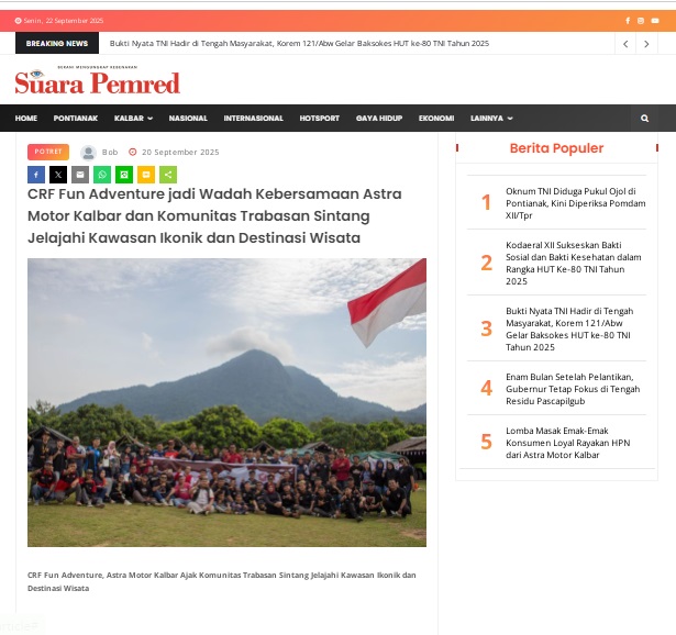 CRF Fun Adventure jadi Wadah Kebersamaan Astra Motor Kalbar dan Komunitas Trabasan Sintang Jelajahi Kawasan Ikonik dan Destinasi Wisata by masmul 20 September 2025 in Silahkan kunjungi https://www.suarapemredkalbar.com/read/potret/20092025/crf-fun-adventure-jadi-wadah-kebersamaan-astra-motor-kalbar-dan-komunitas-trabasan-sintang-jelajahi-kawasan-ikonik-dan-destinasi-wisata. You Might Like Regional Public Launching New ADV160 The SUV Pride Grand Launching New PCX 160 Truly Exceptional! Tetap hati-hati ya bro sist berkendara saat hujan.