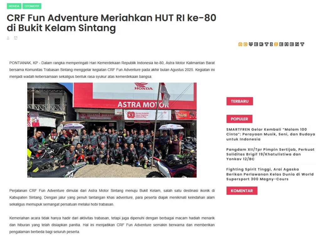 CRF Fun Adventure Meriahkan HUT RI ke-80 di Bukit Kelam Sintang by Muhammad Arif 5 September 2025 in Silahkan kunjungi https://www.kapuaspost.web.id/2025/09/crf-fun-adventure-meriahkan-hut-ri-ke.html. Tags: astra Astra Motor kalbar Astra Motor Pontianak astramotor honda kalbar pontianak sepeda motor You Might Like Regional Public Launching New ADV160 The SUV Pride Grand Launching New PCX 160 Truly Exceptional! Tetap hati-hati ya bro sist berkendara saat hujan.