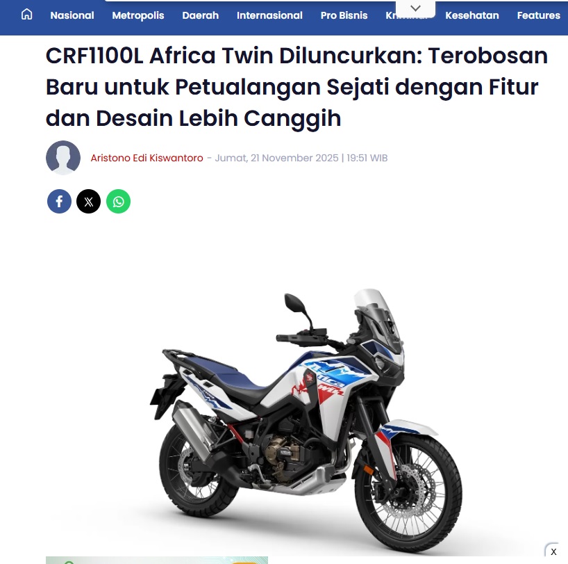 CRF1100L Africa Twin Diluncurkan: Terobosan Baru untuk Petualangan Sejati dengan Fitur dan Desain Lebih Canggih by Aristono Edi Kiswantoro 21 November 2025 in Silahkan kunjungi https://pontianakpost.jawapos.com/pro-bisnis/1466862784/crf1100l-africa-twin-diluncurkan-terobosan-baru-untuk-petualangan-sejati-dengan-fitur-dan-desain-lebih-canggih. You Might Like Regional Public Launching New ADV160 The SUV Pride Grand Launching New PCX 160 Truly Exceptional! Tetap hati-hati ya bro sist berkendara saat hujan.