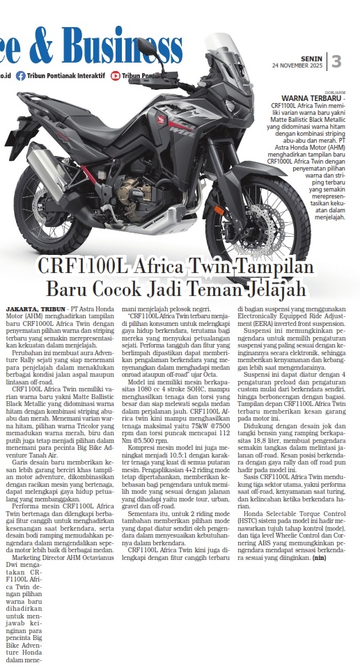 CRF1100L Africa Twin Tampilan CRF1100L Africa Twin Tampilan Baru Cocok Jadi Teman Jelajah by Ishak Ismail 24 November 2025 in Silahkan buka . You Might Like Regional Public Launching New ADV160 The SUV Pride Grand Launching New PCX 160 Truly Exceptional! Tetap hati-hati ya bro sist berkendara saat hujan.