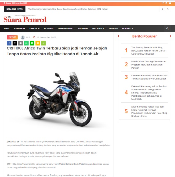CRF1100L Africa Twin Terbaru Siap jadi Teman Jelajah Tanpa Batas Pecinta Big Bike Honda di Tanah Air by masmul 19 November 2025 in Silahkan kunjungi https://www.suarapemredkalbar.com/read/potret/19112025/crf1100l-africa-twin-terbaru-siap-jadi-teman-jelajah-tanpa-batas-pecinta-big-bike-honda-di-tanah-air. You Might Like Regional Public Launching New ADV160 The SUV Pride Grand Launching New PCX 160 Truly Exceptional! Tetap hati-hati ya bro sist berkendara saat hujan.