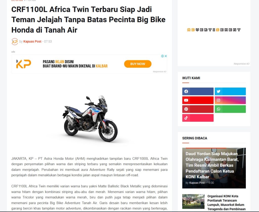 CRF1100L Africa Twin Terbaru Siap Jadi Teman Jelajah Tanpa Batas Pecinta Big Bike Honda di Tanah Air by Muhammad Arif 20 November 2025 in Silahkan kunjungi https://www.kapuaspost.web.id/2025/11/crf1100l-africa-twin-terbaru-siap-jadi.html. Tags: astra Astra Motor kalbar Astra Motor Pontianak astramotor honda kalbar pontianak sepeda motor You Might Like Regional Public Launching New ADV160 The SUV Pride Grand Launching New PCX 160 Truly Exceptional! Tetap hati-hati ya bro sist berkendara saat hujan.