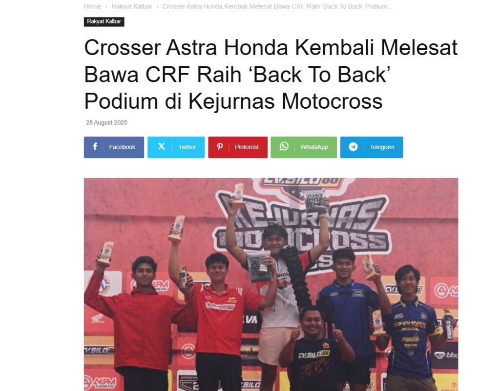 Crosser Astra Honda Kembali Melesat Bawa CRF Raih ‘Back To Back’ Podium di Kejurnas Motocross by Nova Sari 28 Agustus 2025 in Silahkan kunjungi https://equator.co.id/crosser-astra-honda-kembali-melesat-bawa-crf-raih-back-to-back-podium-di-kejurnas-motocross/. You Might Like Regional Public Launching New ADV160 The SUV Pride Grand Launching New PCX 160 Truly Exceptional! Tetap hati-hati ya bro sist berkendara saat hujan.