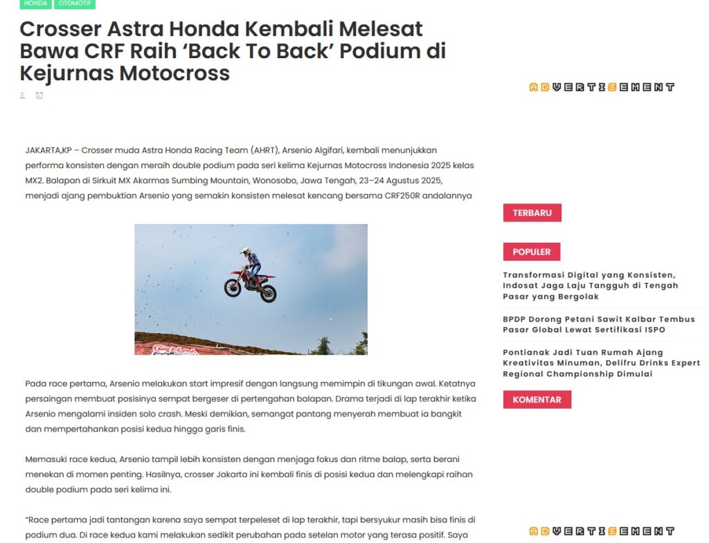 Crosser Astra Honda Kembali Melesat Bawa CRF Raih ‘Back To Back’ Podium di Kejurnas Motocross by Muhammad Arif 26 Agustus 2025 in Silahkan kunjungi https://www.kapuaspost.web.id/2025/08/crosser-astra-honda-kembali-melesat.html. Tags: astra Astra Motor kalbar Astra Motor Pontianak astramotor honda kalbar pontianak sepeda motor You Might Like Regional Public Launching New ADV160 The SUV Pride Grand Launching New PCX 160 Truly Exceptional! Tetap hati-hati ya bro sist berkendara saat hujan.