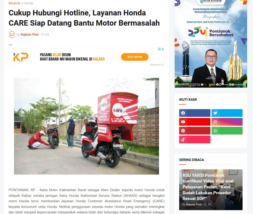 Cukup Hubungi Hotline, Layanan Honda CARE Siap Datang Bantu Motor Bermasalah by Muhammad Arif 20 Oktober 2025 in Silahkan kunjungi https://www.kapuaspost.web.id/2025/10/cukup-hubungi-hotline-layanan-honda.html. Tags: astra Astra Motor kalbar Astra Motor Pontianak astramotor honda kalbar pontianak sepeda motor You Might Like Regional Public Launching New ADV160 The SUV Pride Grand Launching New PCX 160 Truly Exceptional! Tetap hati-hati ya bro sist berkendara saat hujan.