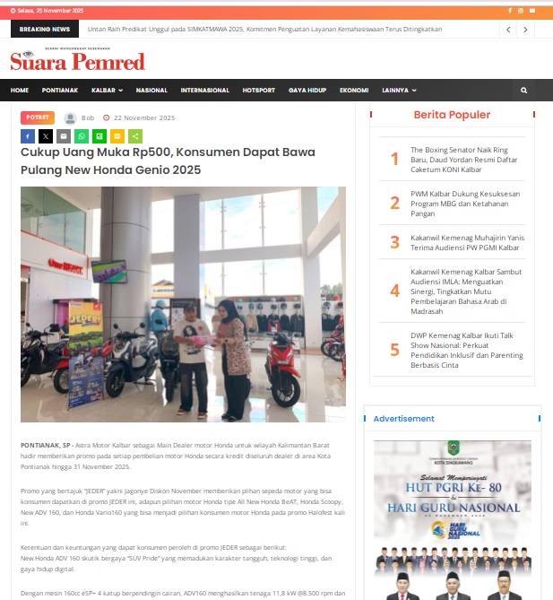 Cukup Uang Muka Rp500, Konsumen Dapat Bawa Pulang New Honda Genio 2025 by masmul 22 November 2025 in Silahkan kunjungi https://www.suarapemredkalbar.com/read/potret/22112025/cukup-uang-muka-rp500-konsumen-dapat-bawa-pulang-new-honda-genio-2025. You Might Like Regional Public Launching New ADV160 The SUV Pride Grand Launching New PCX 160 Truly Exceptional! Tetap hati-hati ya bro sist berkendara saat hujan.