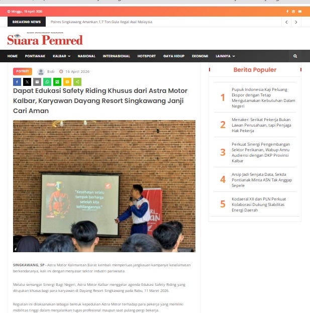 Dapat Edukasi Safety Riding Khusus dari Astra Motor Kalbar, Karyawan Dayang Resort Singkawang Janji Cari Aman by masmul 16 April 2026 in Silahkan kunjungi https://www.suarapemredkalbar.com/read/potret/16042026/dapat-edukasi-safety-riding-khusus-dari-astra-motor-kalbar-karyawan-dayang-resort-singkawang-janji-cari-aman. You Might Like Regional Public Launching New ADV160 The SUV Pride Grand Launching New PCX 160 Truly Exceptional! Tetap hati-hati ya bro sist berkendara saat hujan.