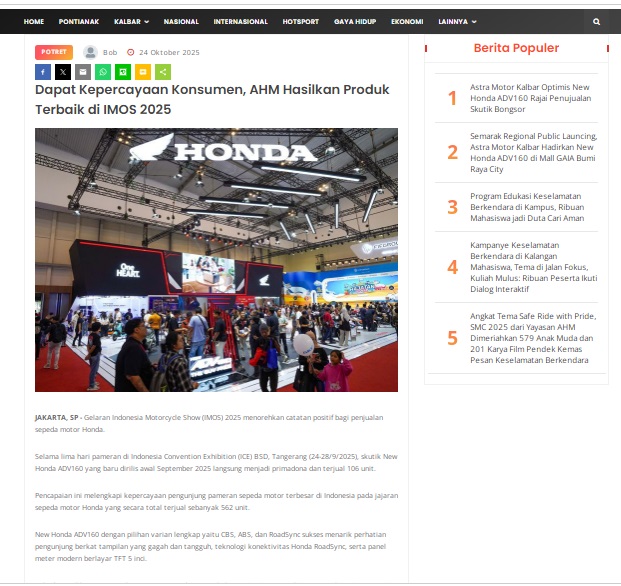 Dapat Kepercayaan Konsumen, AHM Hasilkan Produk Terbaik di IMOS 2025 by masmul 24 Oktober 2025 in Silahkan kunjungi https://www.suarapemredkalbar.com/read/potret/24102025/dapat-kepercayaan-konsumen-ahm-hasilkan-produk-terbaik-di-imos-2025. You Might Like Regional Public Launching New ADV160 The SUV Pride Grand Launching New PCX 160 Truly Exceptional! Tetap hati-hati ya bro sist berkendara saat hujan.