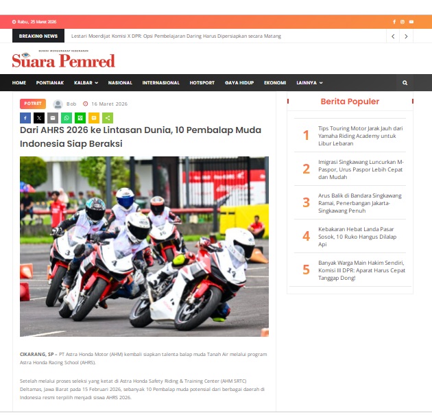 Dari AHRS 2026 ke Lintasan Dunia, 10 Pembalap Muda Indonesia Siap Beraksi by masmul 16 Maret 2026 in Silahkan kunjungi https://www.suarapemredkalbar.com/read/potret/16032026/dari-ahrs-2026-ke-lintasan-dunia-10-pembalap-muda-indonesia-siap-beraksi. You Might Like Regional Public Launching New ADV160 The SUV Pride Grand Launching New PCX 160 Truly Exceptional! Tetap hati-hati ya bro sist berkendara saat hujan.