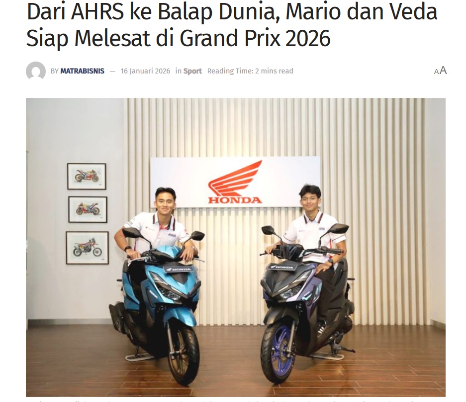 Dari AHRS ke Balap Dunia, Mario dan Veda Siap Melesat di Grand Prix 2026 by Sri Yuliantiningsih 16 Januari 2026 in Silahkan kunjungi https://matrabisnis.id/2026/01/16/dari-ahrs-ke-balap-dunia-mario-dan-veda-siap-melesat-di-grand-prix-2026/. You Might Like Regional Public Launching New ADV160 The SUV Pride Grand Launching New PCX 160 Truly Exceptional! Tetap hati-hati ya bro sist berkendara saat hujan.