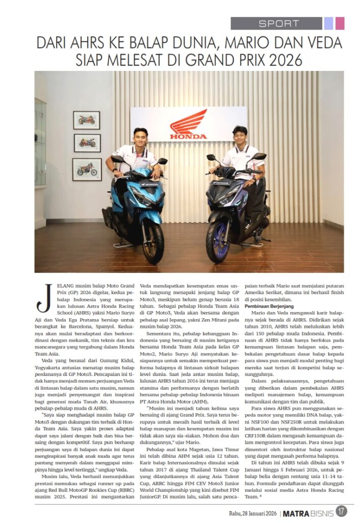 DARI AHRS KE BALAP DUNIA, MARIO DAN VEDA SIAP MELESAT DI GRAND PRIX 2026 by Sri Yuliantiningsih 28 Januari 2026 in Silahkan buka . You Might Like Regional Public Launching New ADV160 The SUV Pride Grand Launching New PCX 160 Truly Exceptional! Tetap hati-hati ya bro sist berkendara saat hujan.