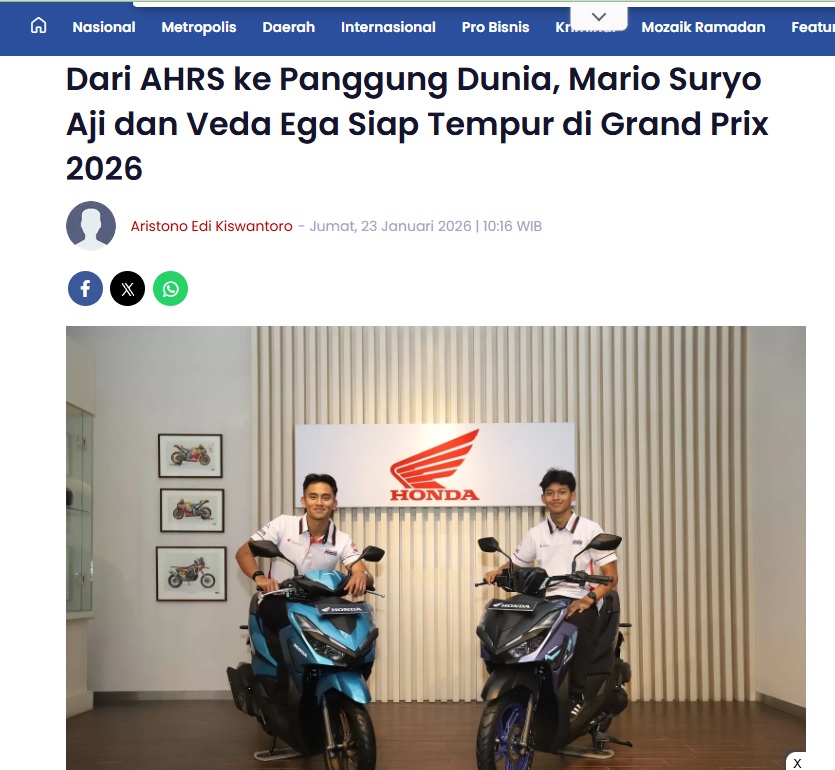 Dari AHRS ke Panggung Dunia, Mario Suryo Aji dan Veda Ega Siap Tempur di Grand Prix 2026 by Aristono Edi Kiswantoro 23 Januari 2026 in Silahkan kunjungi https://pontianakpost.jawapos.com/otomotif/1467101818/dari-ahrs-ke-panggung-dunia-mario-suryo-aji-dan-veda-ega-siap-tempur-di-grand-prix-2026. You Might Like Regional Public Launching New ADV160 The SUV Pride Grand Launching New PCX 160 Truly Exceptional! Tetap hati-hati ya bro sist berkendara saat hujan.