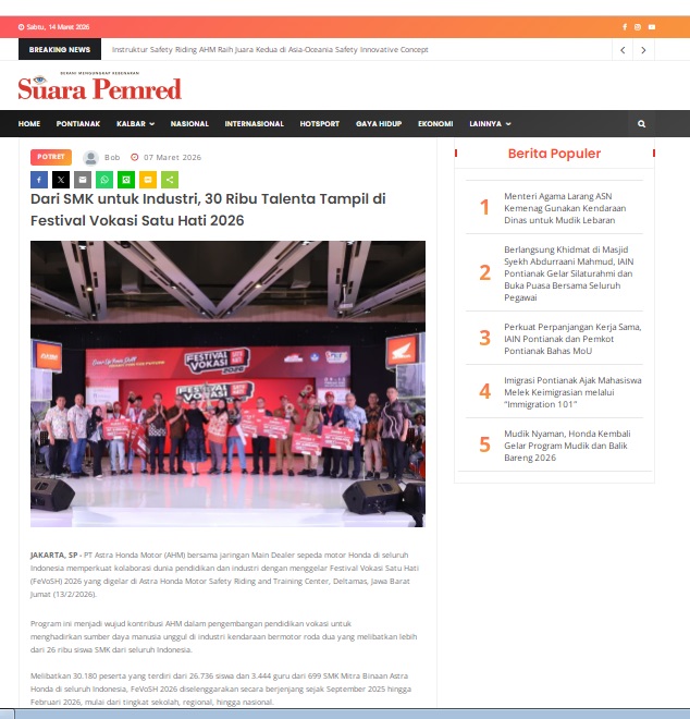 Dari SMK untuk Industri, 30 Ribu Talenta Tampil di Festival Vokasi Satu Hati 2026 by masmul 7 Maret 2026 in Silahkan kunjungi https://www.suarapemredkalbar.com/read/potret/07032026/dari-smk-untuk-industri-30-ribu-talenta-tampil-di-festival-vokasi-satu-hati-2026. You Might Like Regional Public Launching New ADV160 The SUV Pride Grand Launching New PCX 160 Truly Exceptional! Tetap hati-hati ya bro sist berkendara saat hujan.