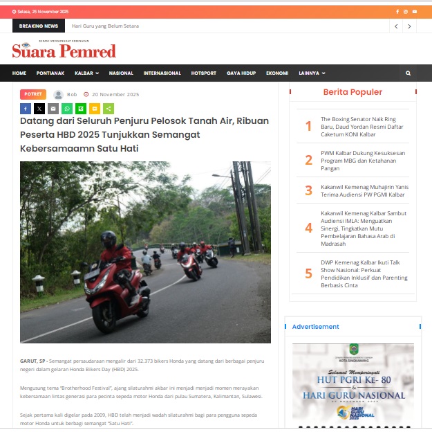 Datang dari Seluruh Penjuru Pelosok Tanah Air, Ribuan Peserta HBD 2025 Tunjukkan Semangat Kebersamaamn Satu Hati by masmul 20 November 2025 in Silahkan kunjungi https://www.suarapemredkalbar.com/read/potret/20112025/datang-dari-seluruh-penjuru-pelosok-tanah-air-ribuan-peserta-hbd-2025-tunjukkan-semangat-kebersamaamn-satu-hati. You Might Like Regional Public Launching New ADV160 The SUV Pride Grand Launching New PCX 160 Truly Exceptional! Tetap hati-hati ya bro sist berkendara saat hujan.