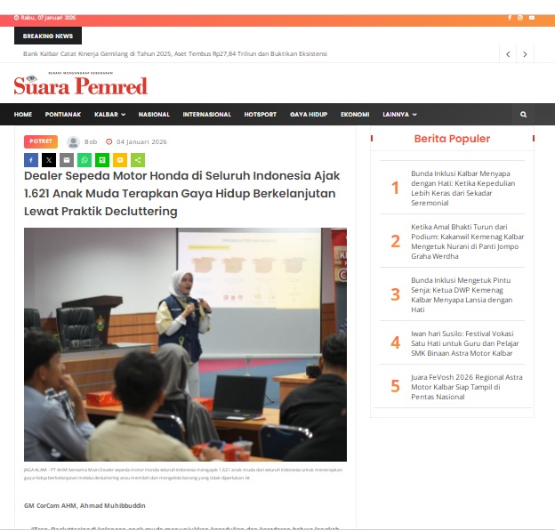 Dealer Sepeda Motor Honda di Seluruh Indonesia Ajak 1.621 Anak Muda Terapkan Gaya Hidup Berkelanjutan Lewat Praktik Decluttering by masmul 4 Januari 2026 in Silahkan kunjungi https://www.suarapemredkalbar.com/read/potret/04012026/dealer-sepeda-motor-honda-di-seluruh-indonesia-ajak-1621-anak-muda-terapkan-gaya-hidup-berkelanjutan-lewat-praktik-decluttering. You Might Like Regional Public Launching New ADV160 The SUV Pride Grand Launching New PCX 160 Truly Exceptional! Tetap hati-hati ya bro sist berkendara saat hujan.