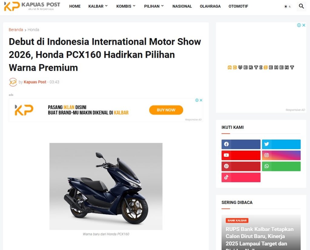 Debut di Indonesia International Motor Show 2026, Honda PCX160 Hadirkan Pilihan Warna Premium by Muhammad Arif 26 Februari 2026 in Silahkan kunjungi https://www.kapuaspost.web.id/2026/02/debut-di-indonesia-international-motor_26.html. Tags: astra Astra Motor kalbar Astra Motor Pontianak astramotor honda kalbar pontianak sepeda motor You Might Like Regional Public Launching New ADV160 The SUV Pride Grand Launching New PCX 160 Truly Exceptional! Tetap hati-hati ya bro sist berkendara saat hujan.
