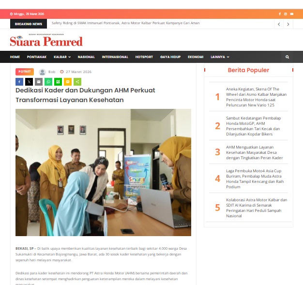 Dedikasi Kader dan Dukungan AHM Perkuat Transformasi Layanan Kesehatan by masmul 27 Maret 2026 in Silahkan kunjungi https://www.suarapemredkalbar.com/read/potret/27032026/dedikasi-kader-dan-dukungan-ahm-perkuat-transformasi-layanan-kesehatan. You Might Like Regional Public Launching New ADV160 The SUV Pride Grand Launching New PCX 160 Truly Exceptional! Tetap hati-hati ya bro sist berkendara saat hujan.