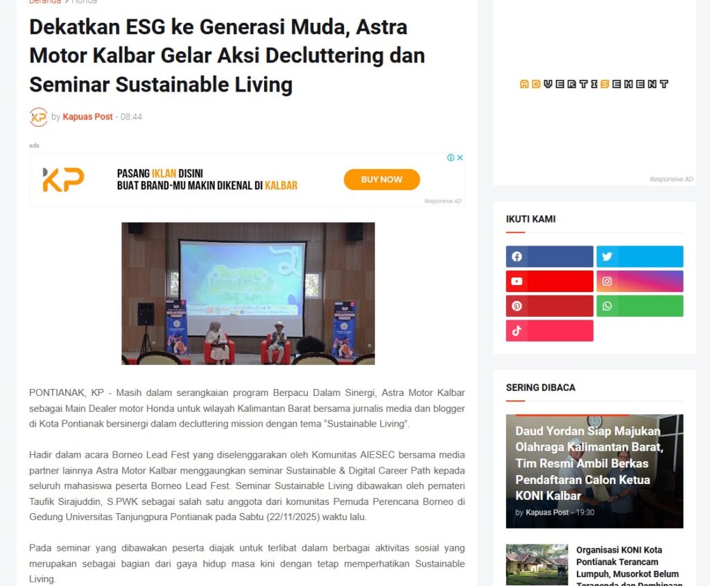 Dekatkan ESG ke Generasi Muda, Astra Motor Kalbar Gelar Aksi Decluttering dan Seminar Sustainable Living by Muhammad Arif 9 Desember 2025 in Silahkan kunjungi https://www.kapuaspost.web.id/2025/12/dekatkan-esg-ke-generasi-muda-astra.html. Tags: astra Astra Motor kalbar Astra Motor Pontianak astramotor honda kalbar pontianak sepeda motor You Might Like Regional Public Launching New ADV160 The SUV Pride Grand Launching New PCX 160 Truly Exceptional! Tetap hati-hati ya bro sist berkendara saat hujan.