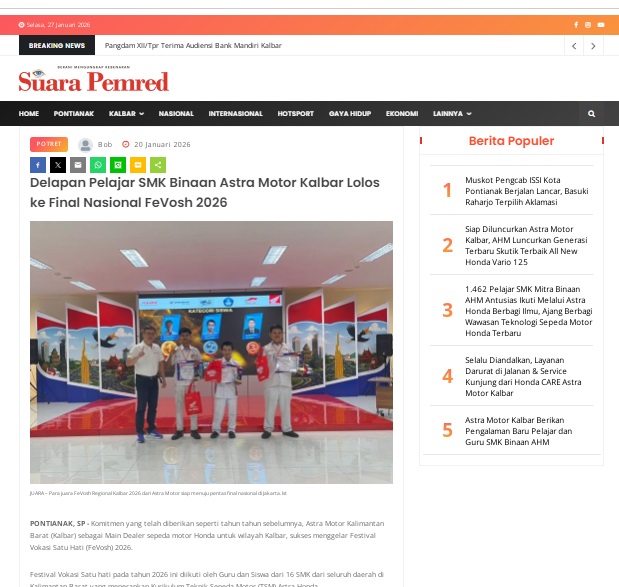 Delapan Pelajar SMK Binaan Astra Motor Kalbar Lolos ke Final Nasional FeVosh 2026 Photo of Delapan Pelajar SMK Binaan Astra Motor Kalbar Lolos ke Final Nasional FeVosh 2026 by masmul 20 Januari 2026 in Silahkan kunjungi https://www.suarapemredkalbar.com/read/potret/20012026/delapan-pelajar-smk-binaan-astra-motor-kalbar-lolos-ke-final-nasional-fevosh-2026. You Might Like Regional Public Launching New ADV160 The SUV Pride Grand Launching New PCX 160 Truly Exceptional! Tetap hati-hati ya bro sist berkendara saat hujan.