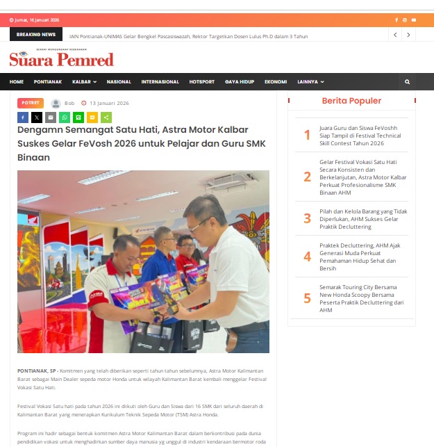 Dengan Semangat Satu Hati, Astra Motor Kalbar Suskes Gelar FeVosh 2026 untuk Pelajar dan Guru SMK Binaan by masmul 13 Januari 2026 in Silahkan kunjungi https://www.suarapemredkalbar.com/read/potret/13012026/dengamn-semangat-satu-hati-astra-motor-kalbar-suskes-gelar-fevosh-2026-untuk-pelajar-dan-guru-smk-binaan. You Might Like Regional Public Launching New ADV160 The SUV Pride Grand Launching New PCX 160 Truly Exceptional! Tetap hati-hati ya bro sist berkendara saat hujan.