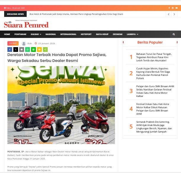 Deretan Motor Terbaik Honda Dapat Promo Sejiwa, Warga Sekadau Serbu Dealer Resmi by masmul 23 Januari 2026 in Silahkan kunjungi https://www.suarapemredkalbar.com/read/potret/23012026/deretan-motor-terbaik-honda-dapat-promo-sejiwa-warga-sekadau-serbu-dealer-resmi. You Might Like Regional Public Launching New ADV160 The SUV Pride Grand Launching New PCX 160 Truly Exceptional! Tetap hati-hati ya bro sist berkendara saat hujan.