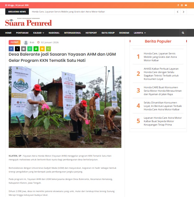 Desa Balerante jadi Sasaran Yayasan AHM dan UGM Gelar Program KKN Tematik Satu Hati by masmul 2 Januari 2026 in Silahkan kunjungi https://www.suarapemredkalbar.com/read/potret/02012026/desa-balerante-jadi-sasaran-yayasan-ahm-dan-ugm-gelar-program-kkn-tematik-satu-hati. You Might Like Regional Public Launching New ADV160 The SUV Pride Grand Launching New PCX 160 Truly Exceptional! Tetap hati-hati ya bro sist berkendara saat hujan.