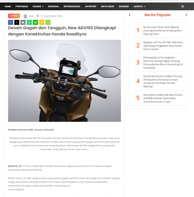 Desain Gagah dan Tangguh, New ADV160 Dilengkapi dengan Konektivitas Honda RoadSync by masmul 15 September 2025 in Silahkan kunjungi https://www.suarapemredkalbar.com/read/potret/15092025/desain-gagah-dan-tangguh-new-adv160-dilengkapi-dengan-konektivitas-honda-roadsync. You Might Like Regional Public Launching New ADV160 The SUV Pride Grand Launching New PCX 160 Truly Exceptional! Tetap hati-hati ya bro sist berkendara saat hujan.