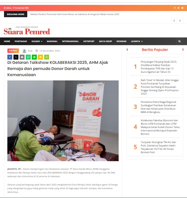 Di Gelaran Talkshow KOLABERAKSI 2025, AHM Ajak Remaja dan pemuda Donor Darah untuk Kemanusiaan by masmul 14 November 2025 in Silahkan kunjungi https://www.suarapemredkalbar.com/read/potret/14112025/di-gelaran-talkshow-kolaberaksi-2025-ahm-ajak-remaja-dan-pemuda-donor-darah-untuk-kemanusiaan. You Might Like Regional Public Launching New ADV160 The SUV Pride Grand Launching New PCX 160 Truly Exceptional! Tetap hati-hati ya bro sist berkendara saat hujan.
