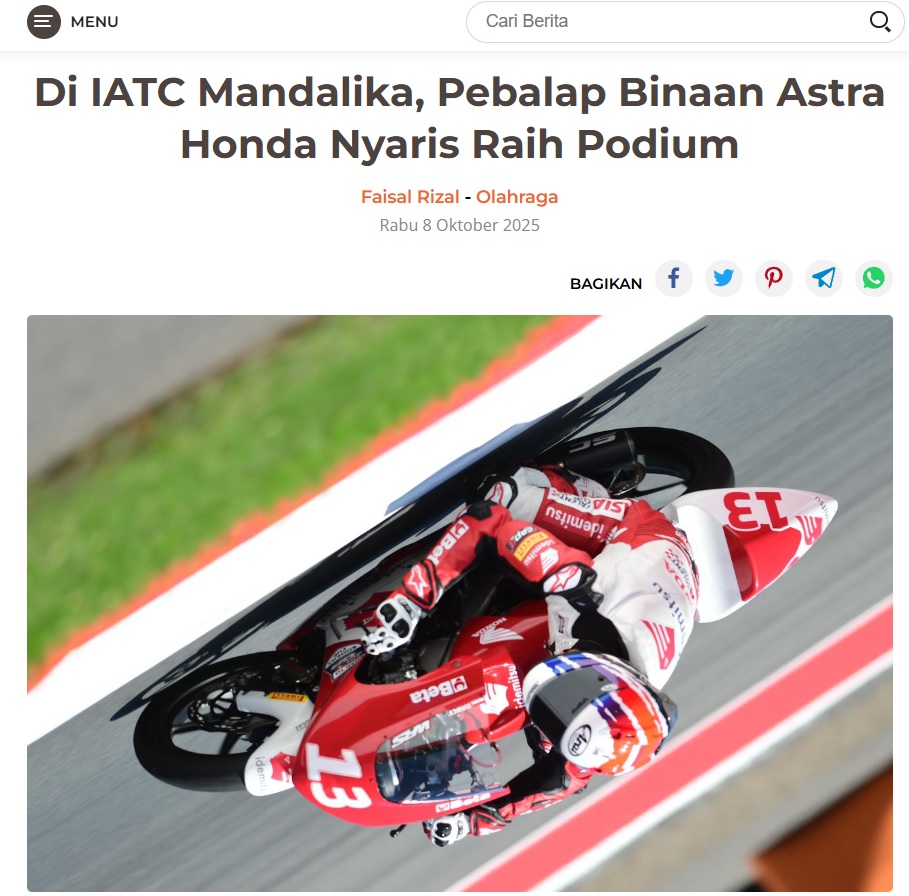 Di IATC Mandalika, Pebalap Binaan Astra Honda Nyaris Raih Podium by Dodi Dodi 8 Oktober 2025 in Silahkan kunjungi https://harianberkat.com/2025/10/08/di-iatc-mandalika-pebalap-binaan-astra-honda-nyaris-raih-podium/. You Might Like Regional Public Launching New ADV160 The SUV Pride Grand Launching New PCX 160 Truly Exceptional! Tetap hati-hati ya bro sist berkendara saat hujan.