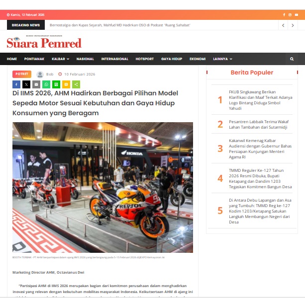 Di IIMS 2026, AHM Hadirkan Berbagai Pilihan Model Sepeda Motor Sesuai Kebutuhan dan Gaya Hidup Konsumen yang Beragam by masmul 10 Februari 2026 in Silahkan kunjungi https://www.suarapemredkalbar.com/read/potret/10022026/di-iims-2026-ahm-hadirkan-berbagai-pilihan-model-sepeda-motor-sesuai-kebutuhan-dan-gaya-hidup-konsumen-yang-beragam. You Might Like Regional Public Launching New ADV160 The SUV Pride Grand Launching New PCX 160 Truly Exceptional! Tetap hati-hati ya bro sist berkendara saat hujan.
