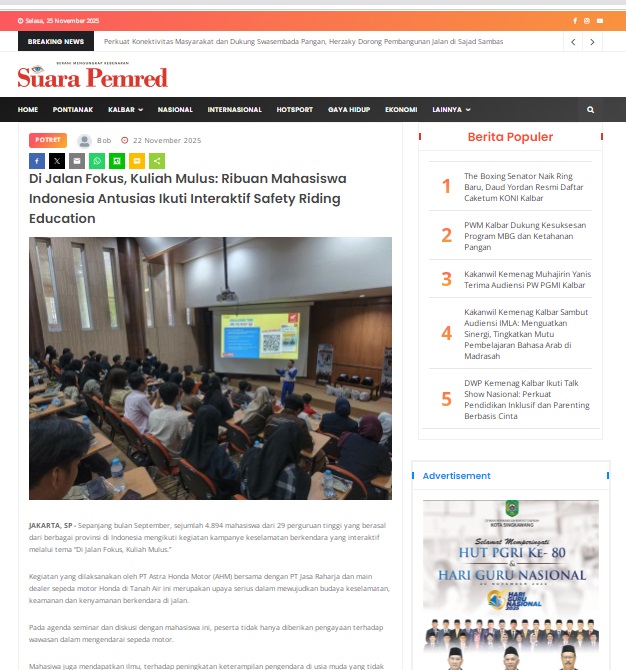 Di Jalan Fokus, Kuliah Mulus: Ribuan Mahasiswa Indonesia Antusias Ikuti Interaktif Safety Riding Education by masmul 22 November 2025 in Silahkan kunjungi https://www.suarapemredkalbar.com/read/potret/22112025/di-jalan-fokus-kuliah-mulus-ribuan-mahasiswa-indonesia-antusias-ikuti-interaktif-safety-riding-education. You Might Like Regional Public Launching New ADV160 The SUV Pride Grand Launching New PCX 160 Truly Exceptional! Tetap hati-hati ya bro sist berkendara saat hujan.