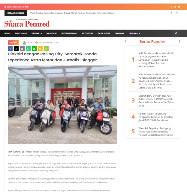 Diakhiri dengan Rolling City, Semarak Honda Experience Astra Motor dan Jurnalis-Blogger by masmul 6 November 2025 in Silahkan kunjungi https://www.suarapemredkalbar.com/read/potret/06112025/diakhiri-dengan-rolling-city-semarak-honda-experience-astra-motor-dan-jurnalis-blogger. You Might Like Regional Public Launching New ADV160 The SUV Pride Grand Launching New PCX 160 Truly Exceptional! Tetap hati-hati ya bro sist berkendara saat hujan.