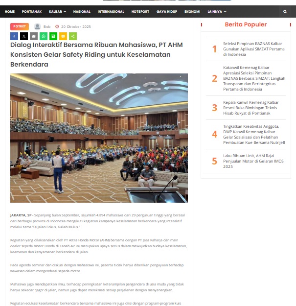 Dialog Interaktif Bersama Ribuan Mahasiswa, PT AHM Konsisten Gelar Safety Riding untuk Keselamatan Berkendara by masmul 20 Oktober 2025 in Silahkan kunjungi https://www.suarapemredkalbar.com/read/potret/20102025/dialog-interaktif-bersama-ribuan-mahasiswa-pt-ahm-konsisten-gelar-safety-riding-untuk-keselamatan-berkendara. You Might Like Regional Public Launching New ADV160 The SUV Pride Grand Launching New PCX 160 Truly Exceptional! Tetap hati-hati ya bro sist berkendara saat hujan.