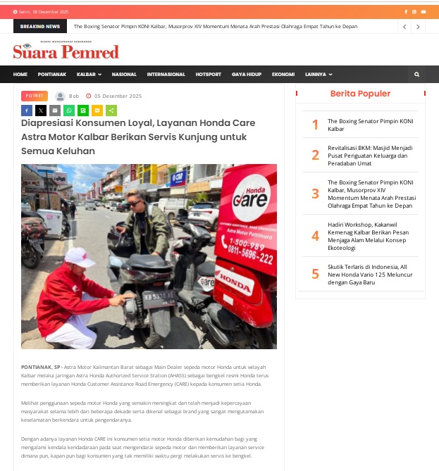 Diapresiasi Konsumen Loyal, Layanan Honda Care Astra Motor Kalbar Berikan Servis Kunjung untuk Semua Keluhan by masmul 5 Desember 2025 in Silahkan kunjungi https://www.suarapemredkalbar.com/read/potret/05122025/diapresiasi-konsumen-loyal-layanan-honda-care-astra-motor-kalbar-berikan-servis-kunjung-untuk-semua-keluhan. You Might Like Regional Public Launching New ADV160 The SUV Pride Grand Launching New PCX 160 Truly Exceptional! Tetap hati-hati ya bro sist berkendara saat hujan.