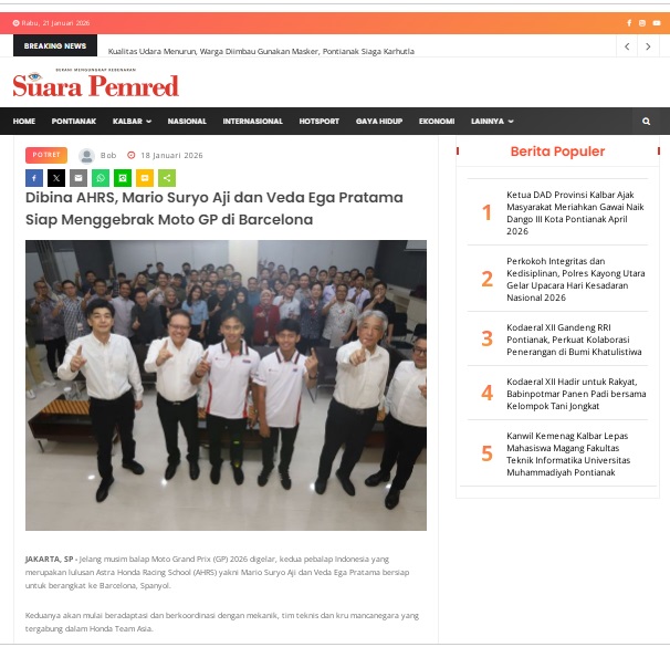 Dibina AHRS, Mario Suryo Aji dan Veda Ega Pratama Siap Menggebrak Moto GP di Barcelona by masmul 18 Januari 2026 in Silahkan kunjungi https://www.suarapemredkalbar.com/read/potret/18012026/dibina-ahrs-mario-suryo-aji-dan-veda-ega-pratama-siap-menggebrak-moto-gp-di-barcelona. You Might Like Regional Public Launching New ADV160 The SUV Pride Grand Launching New PCX 160 Truly Exceptional! Tetap hati-hati ya bro sist berkendara saat hujan.