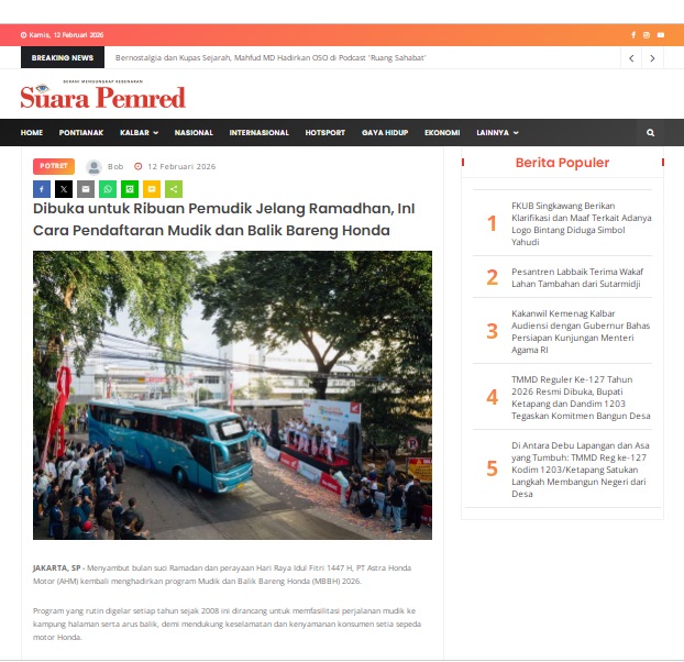 Dibuka untuk Ribuan Pemudik Jelang Ramadhan, InI Cara Pendaftaran Mudik dan Balik Bareng Honda by masmul 12 Februari 2026 in Silahkan kunjungi https://www.suarapemredkalbar.com/read/potret/12022026/dibuka-untuk-ribuan-pemudik-jelang-ramadhan-ini-cara-pendaftaran-mudik-dan-balik-bareng-honda. You Might Like Regional Public Launching New ADV160 The SUV Pride Grand Launching New PCX 160 Truly Exceptional! Tetap hati-hati ya bro sist berkendara saat hujan.