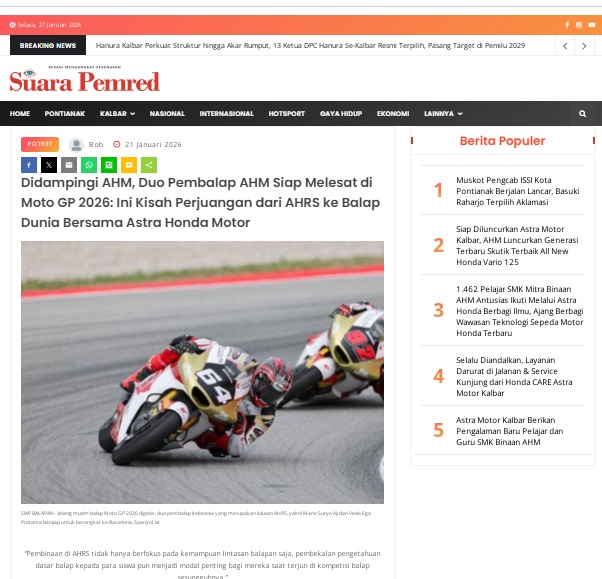 Didampingi AHM, Duo Pembalap AHM Siap Melesat di Moto GP 2026: Ini Kisah Perjuangan dari AHRS ke Balap Dunia Bersama Astra Honda Motor by masmul 21 Januari 2026 in Silahkan kunjungi https://www.suarapemredkalbar.com/read/potret/21012026/didampingi-ahm-duo-pembalap-ahm-siap-melesat-di-moto-gp-2026-ini-kisah-perjuangan-dari-ahrs-ke-balap-dunia-bersama-astra-honda-motor. You Might Like Regional Public Launching New ADV160 The SUV Pride Grand Launching New PCX 160 Truly Exceptional! Tetap hati-hati ya bro sist berkendara saat hujan.