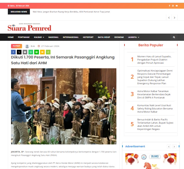 Diikuti 1.700 Peserta, InI Semarak Pasanggiri Angklung Satu Hati dari AHM by masmul 27 Februari 2026 in Silahkan kunjungi https://www.suarapemredkalbar.com/read/potret/27022026/diikuti-1700-peserta-ini-semarak-pasanggiri-angklung-satu-hati-dari-ahm. You Might Like Regional Public Launching New ADV160 The SUV Pride Grand Launching New PCX 160 Truly Exceptional! Tetap hati-hati ya bro sist berkendara saat hujan.
