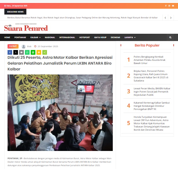 Diikuti 25 Peserta, Astra Motor Kalbar Berikan Apresiasi Gelaran Pelatihan Jurnalistik Perum LKBN ANTARA Biro Kalbar by masmul 23 September 2025 in Silahkan kunjungi https://www.suarapemredkalbar.com/read/potret/23092025/diikuti-25-peserta-astra-motor-kalbar-berikan-apresiasi-gelaran-pelatihan-jurnalistik-perum-lkbn-antara-biro-kalbar. You Might Like Regional Public Launching New ADV160 The SUV Pride Grand Launching New PCX 160 Truly Exceptional! Tetap hati-hati ya bro sist berkendara saat hujan.